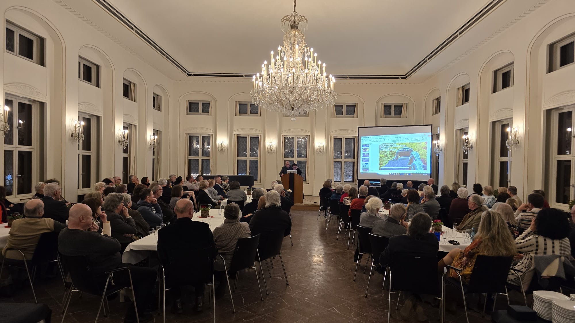 Und somit empfing uns der prachtvolle Barockbau mit einem Festsaal, der uns alle durch seine stilvolle Einrichtung begeisterte: die elegante dunkelgraue Bestuhlung harmonisierte perfekt mit der dezenten schwarzen Umrahmung des Deckenstuckes und dem Blüthner Flügel, den goldumfassten Fensterlaibungen und den zweiarmigen Wandleuchtern dazwischen, und, vor allen Dingen dem ausladenden Kronleuchter an der Decke. Durch dieses Ambiente erfuhr unsere Veranstaltung ein deutliches „Upgrade“!