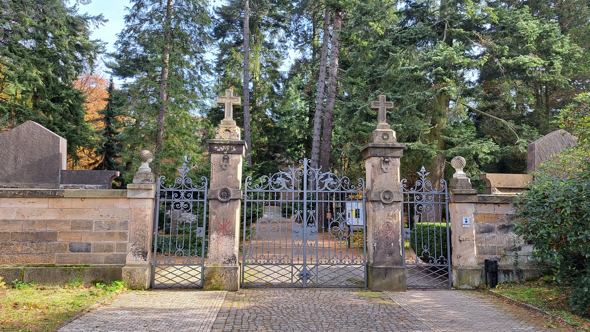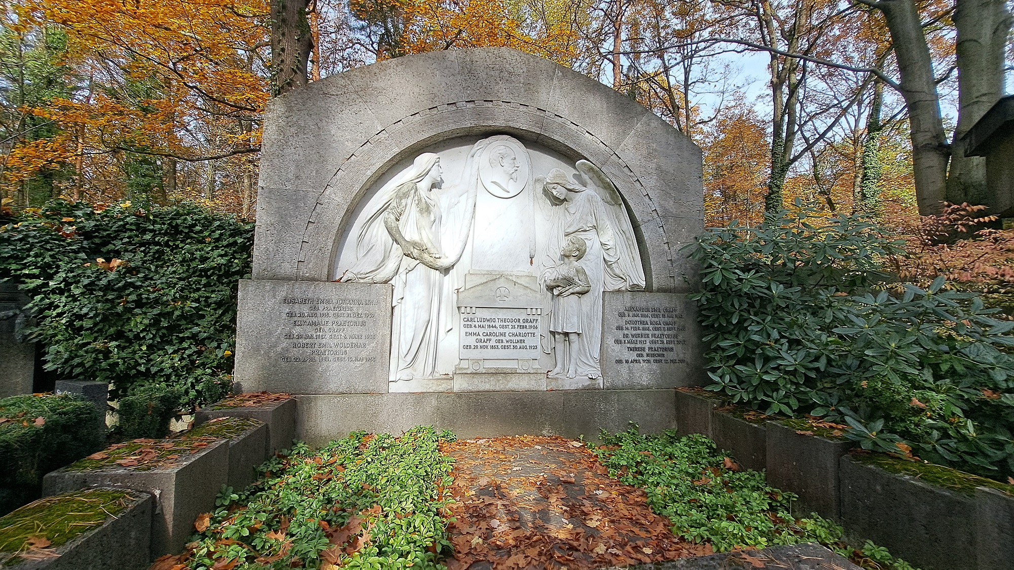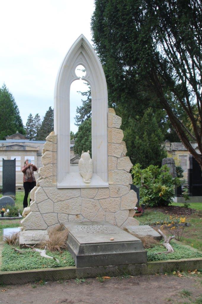 Der Himmel war uns gnädig – wir hatten schönes herbstliches Wetter, als wir gegen 10:30 Uhr den beeindruckenden Waldfriedhof im noblen Dresdner Stadtteil „Weißer Hirsch“ betraten. Dessen fast einhundert- dreißigjährige Geschichte spiegelt beeindruckend die Grabmalarchitektur der Gründerzeit wider – der von Sandsteinmauern umschlossene terrassenförmig angelegte Friedhof strahlt Ruhe und Geborgenheit, Tröstung und Zuversicht aus. Wohl an keinem anderen Grabmal zeigt sich dies deutlicher als am berühmten Mausoleum des Großindustriellen Johann Carl Müller, dessen vom bedeutenden Bildhauer Johannes Schilling geschaffene weißmarmorne Skulpturengruppe ein Gipfelwerk der sächsischen Grabmalkunst darstellt.