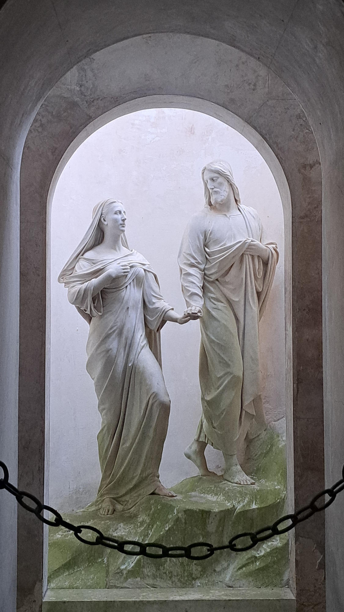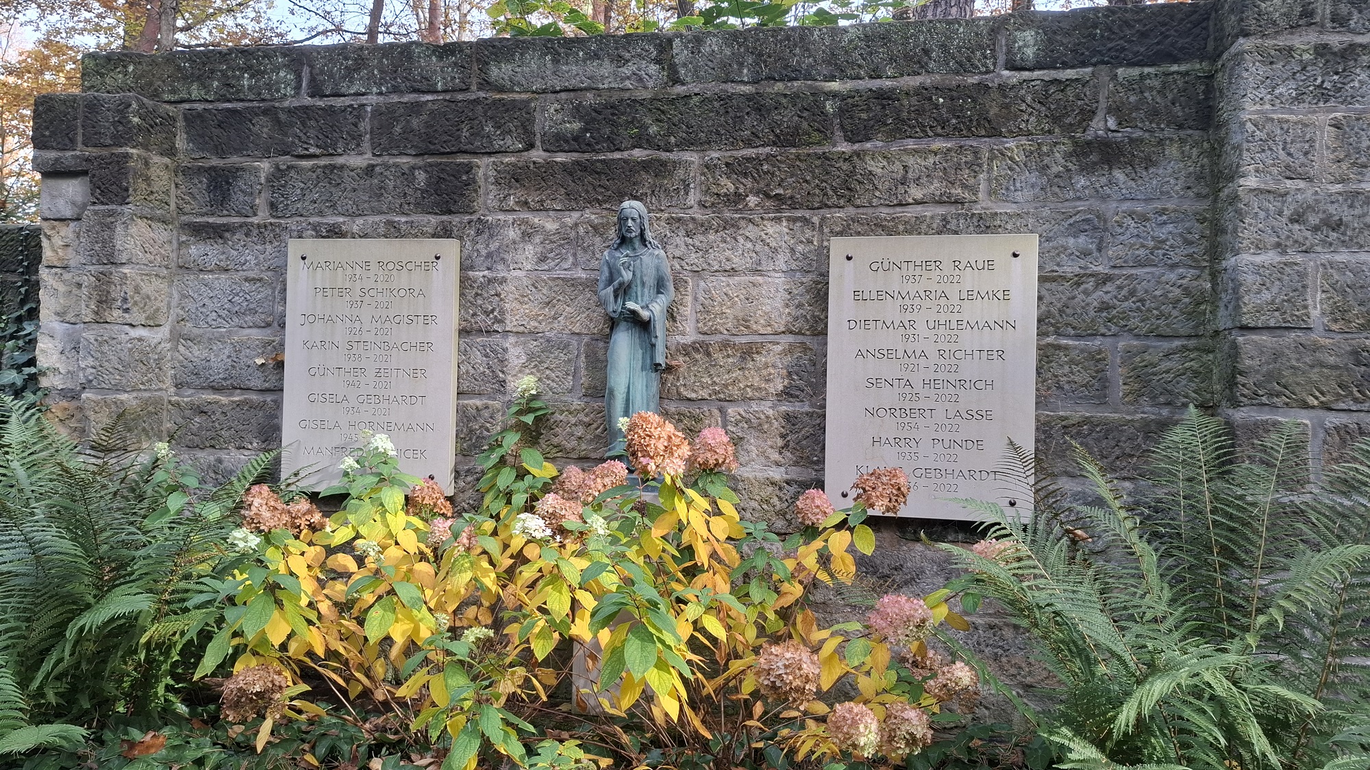 Waldfriedhof Weißer Hirsch Dresden | Wandstelle mit bronzenem Christus im Segensgestus | unbekannter Bildhauer | Fotografie: Manfred Lennig -