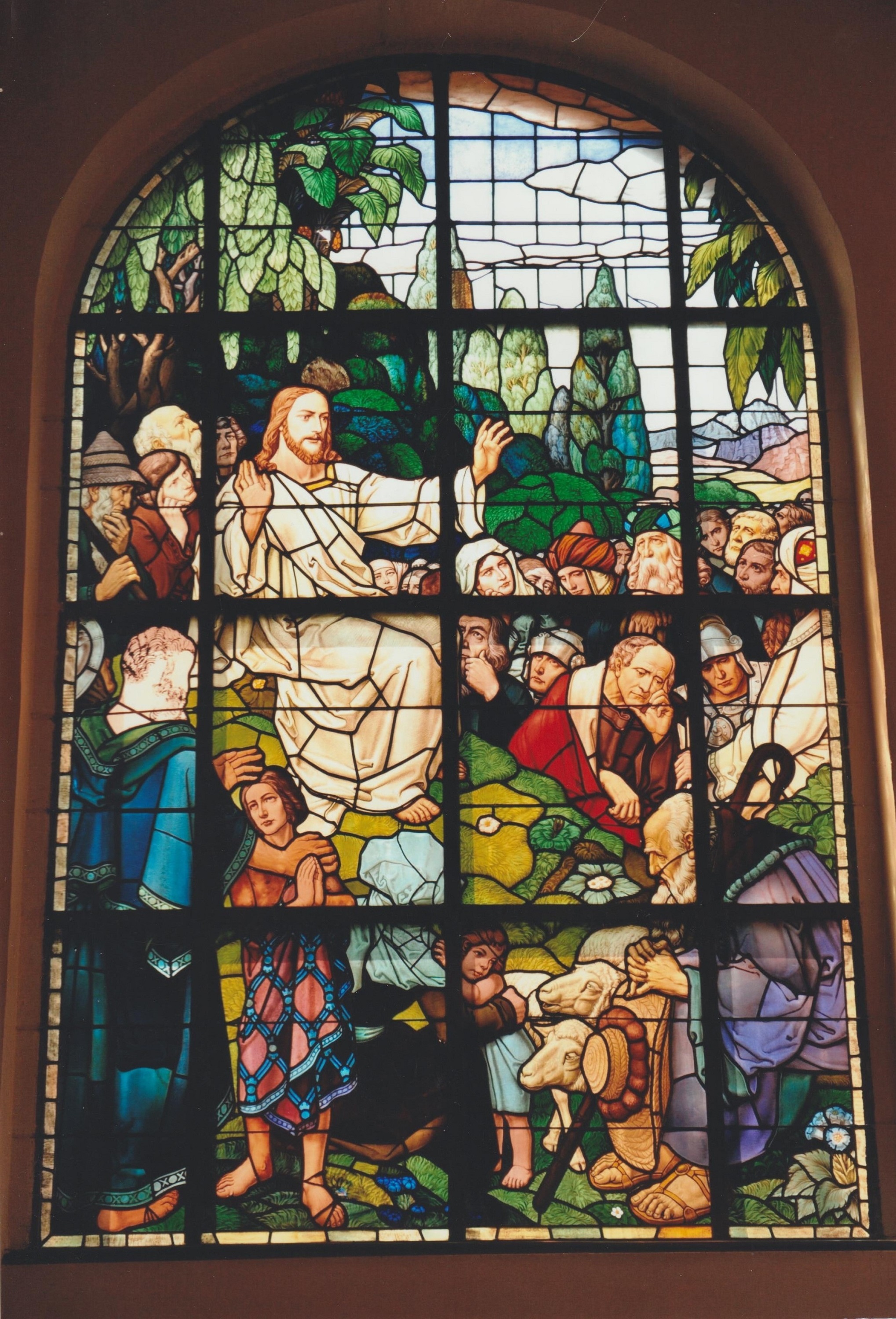 Im Jahre 1909 stiftete der Königlich-Sächsische Kommerzienrat Robert Tümmler den für den Neubau des Gemeinschaftshauses der 1899 gegründeten Landeskirchlichen Gemeinschaft in Döbeln vier von der bedeutenden Leipziger Glasmalerwerkstatt Schulze & Stokinger geschaffene große Bleiglasfenster, darunter das hier abgebildete Fenster mit dem Titel „Die Bergpredigt Jesu“.