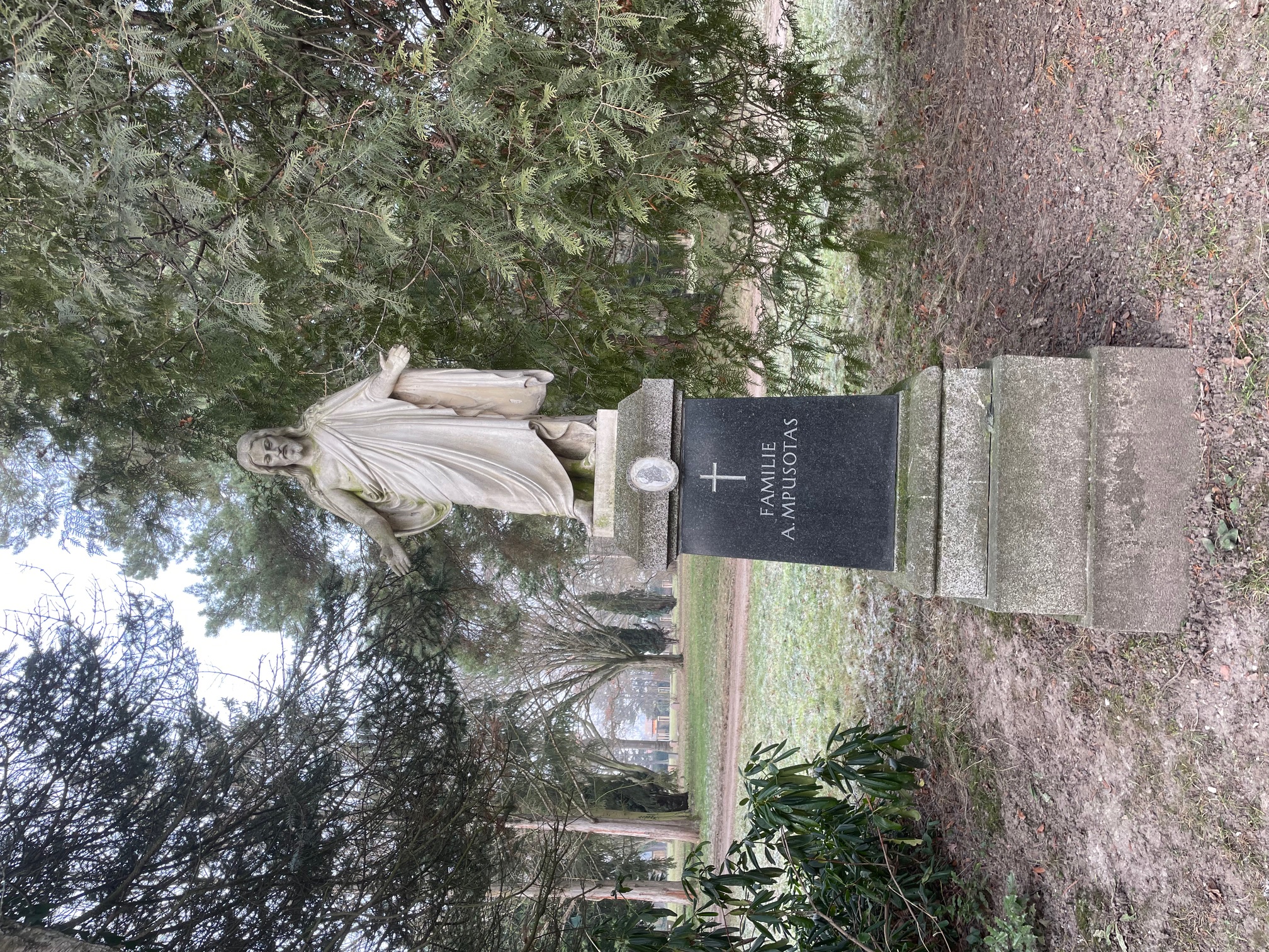 Die an der Front des stelenartigen Grabmals eingearbeitete Tafel aus schwedischem Syenit zeigt ein eingearbeitetes lateinisches Kreuz und die Inschrift „Familie A. Mpusotas“ – sie dürfte in den sechziger Jahren ausgetauscht worden sein gegen eine ursprüngliche Tafel gleichen Materiales, die allerdings mit den Namen der hier erstbestatteten Toten versehen war. Nach dem Tode der Gerda Mpusotas, die 1962 im Alter von sechzig Jahren starb und am 22. Juni 1962 hier beerdigt wurde, folgte schon zwei Jahre später der achtundsiebzigjährig verstorbene Gatte Apostolys Mpusotas, dessen Asche über dem Sarg der Ehefrau beigesetzt wurde.