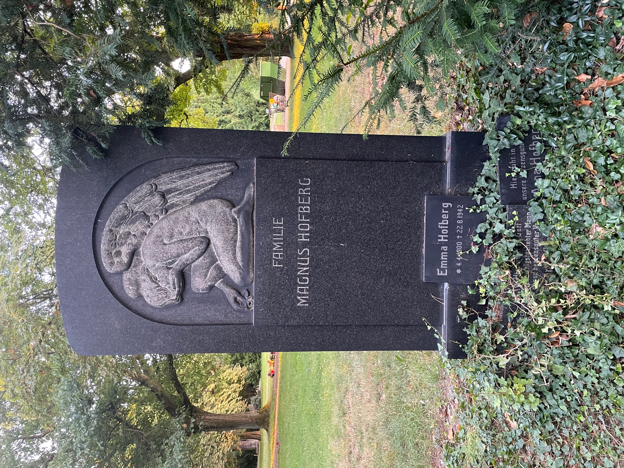 Im Auftrag der Witwe Anna Hofberg beantragte der Leipziger Bildhauer Alfred Fränzel am 10. Februar 1920 die Genehmigung für die Errichtung eines Grabmals aus allseitig poliertem schwedischen Syenit, in dessen Zentrum sich ein erhaben aus dem Stein gemeißelten Relief mit der Darstellung eines Engels zeigt.