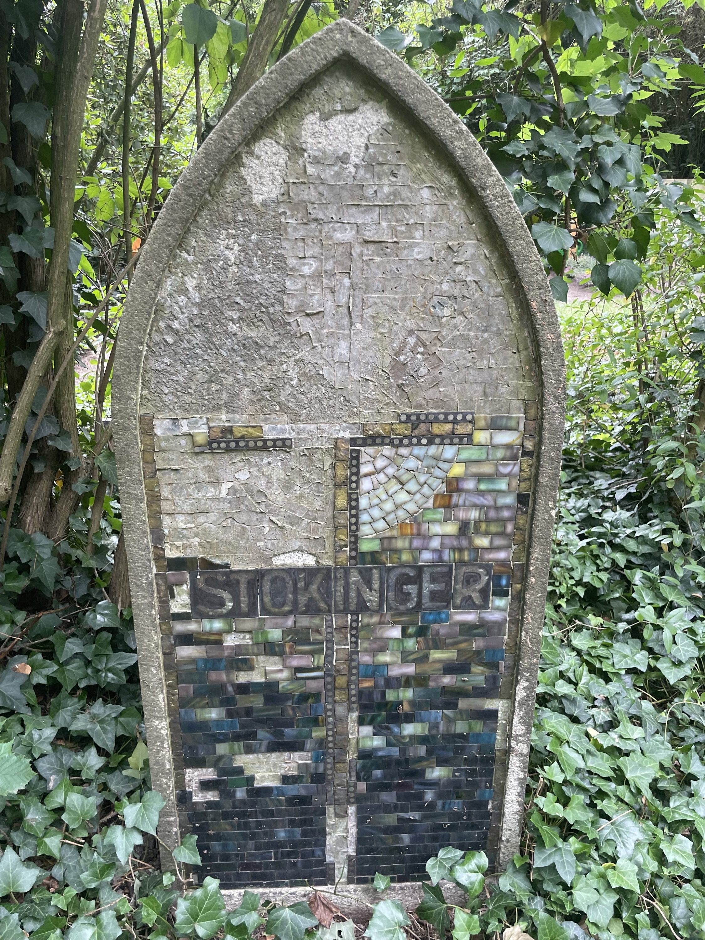 In der XVI. Abteilung des Südfriedhofes befindet sich ein einzigartiges Zeugnis der Grabmalkultur unserer Leipziger Friedhöfe – das Grabmal Stokinger in der XVI. Abteilung des Südfriedhofes. Es dürfte im Jahre 1929 in der Blütezeit des Art déco entstanden sein, gearbeitet in der Form eines gotischen Kirchenfensters. Während die umrahmte Front in der vollständigen Fläche einst mit einem farbenprächtigen Glasmosaik geschmückt war, trägt die fein gestockte und seitlich gekehlte Rück-seite des Grabmales den Namen MARIE STOKINGER sowie deren Lebensdaten 1882 bis 1928.