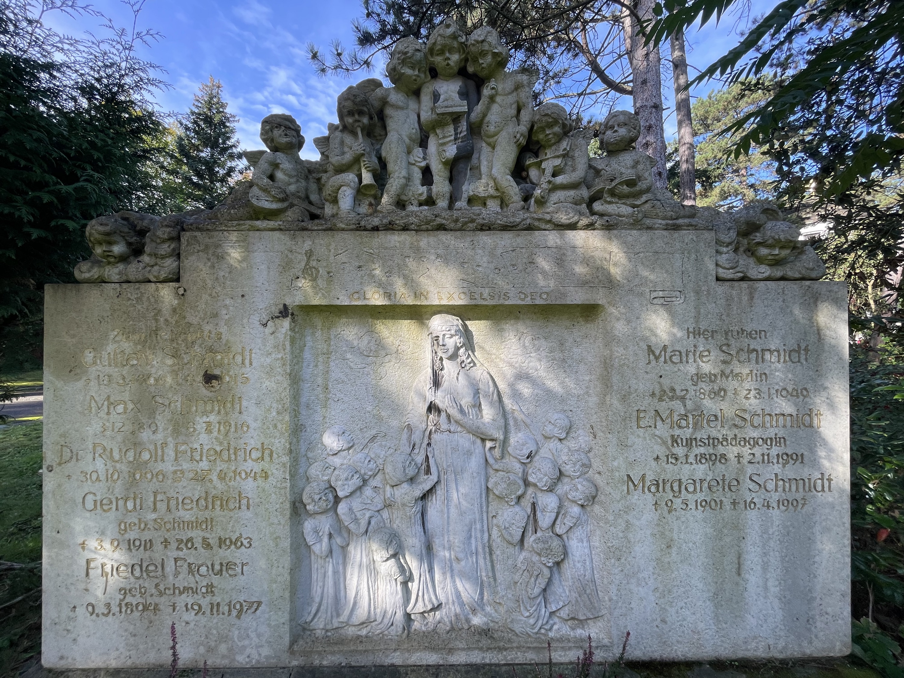 Stuckenbruck folgte schließlich den Intentionen der kunstsinnige Tochter Martel Schmidt, einer angehenden Kunstpädagogin, deren religiöse und musische Ambitionen sich gestalterisch deutlich im Grabmal finden.