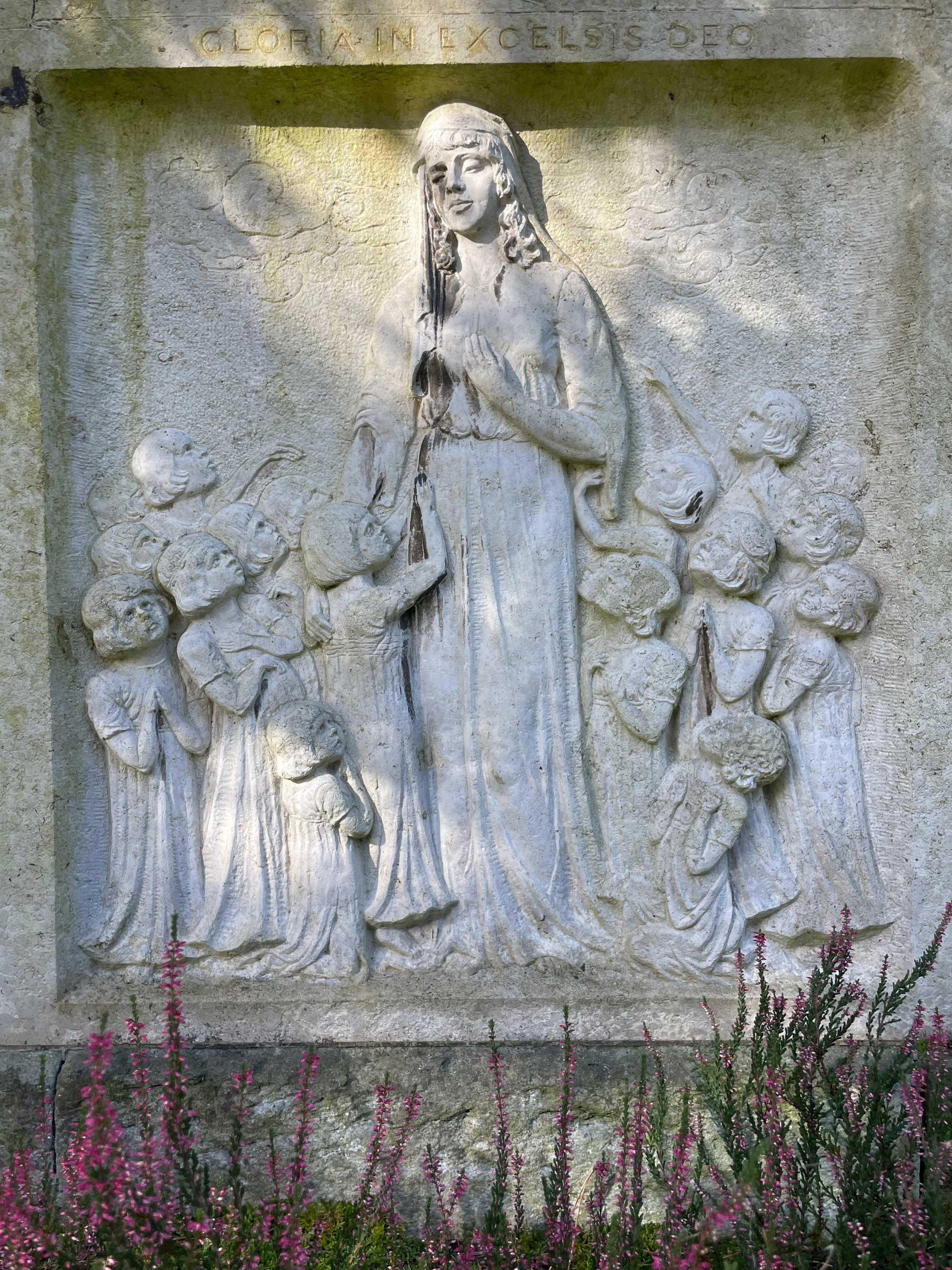 Während das Bildwerk an die hier bestattete erste Frau von Fiedler erinnert, verweist die Inschrift