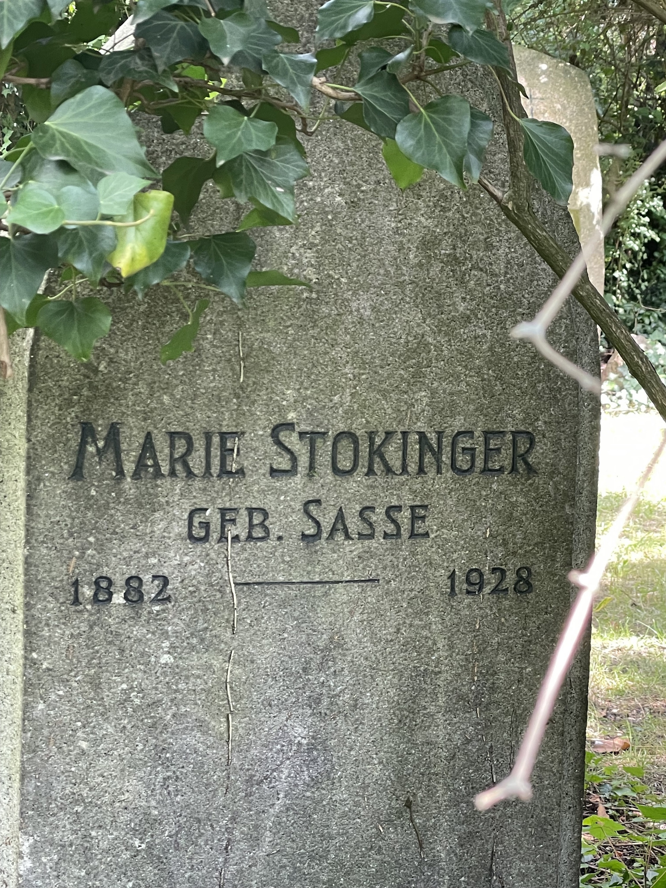 Vermutlich erwarb die Familie Stokinger im Jahre 1928 die beiden Rabattengräber No.55 und No.56, denn in diesem Jahre starb die auf dem Grabstein erwähnte Marie Stokinger geb. Sasse im Alter von erst 46 Jahren und wurde im Grabe beerdigt. Sie war die Glasmalers-Ehefrau des Josef Stokinger.