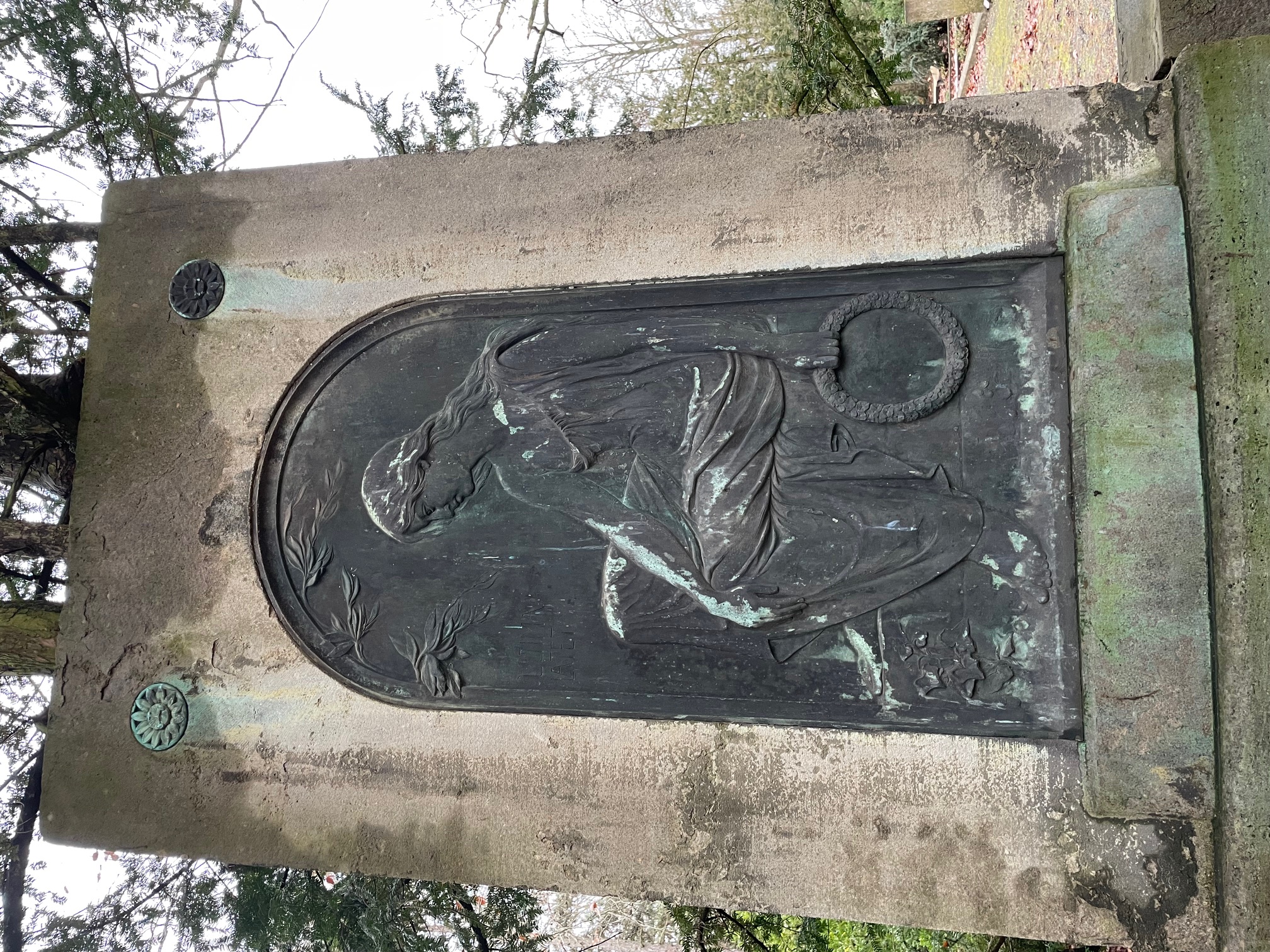 auf den einst hier ruhenden Architekten und seine beiden Frauen. Aus Sicht des Autors ist die Inschrift bereits zeitgleich mit dem Bildwerk – wohl im Herbst 1934 – eingearbeitet worden, lediglich die Lebensdaten des Architekten wurden nach dessen Tod eingearbeitet.