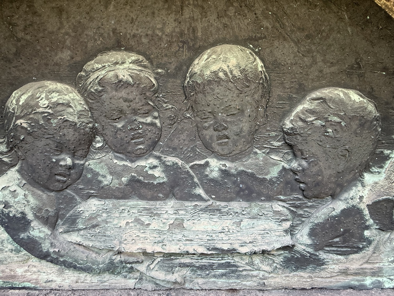 Über der großen granitenen Schrifttafel findet sich eine Lünette mit einem bronzenen Bildwerk von der Hand des bedeutenden Bildhauers Josef Magr. Dargestellt sind vier singende Putti, in ihren Händen ein Notenblatt haltend. Diese geflügelten Knäblein symbolisieren seit jeher eine Verbindung zwischen dem Himmlischen und dem Irdischen und passen so recht zu dieser Stätte der Ewigkeit.