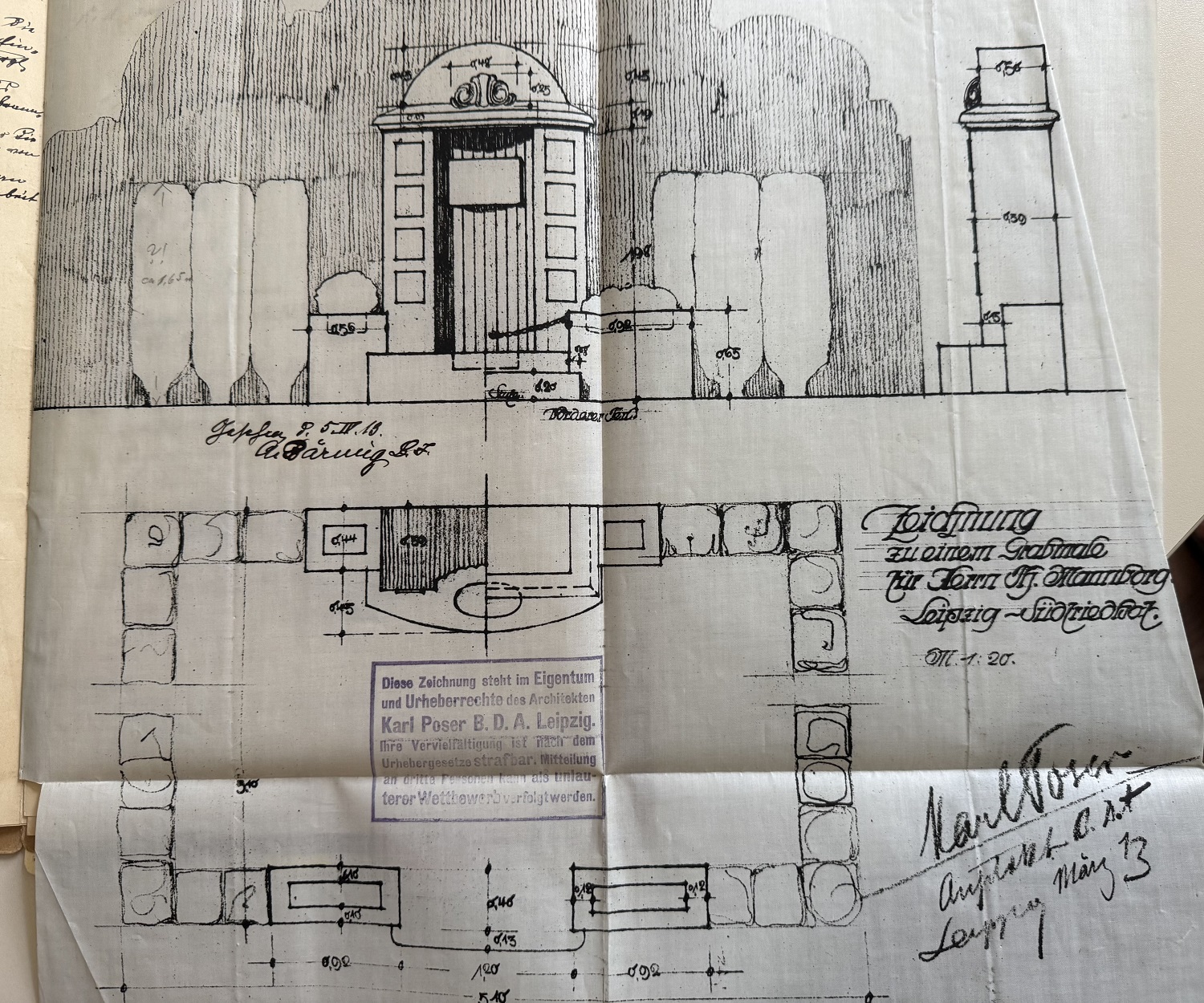 Als Material für die Skulptur wird Untersberger Marmor benannt, der Sockel soll aus Beuchaer Granit gefertigt werden. Der Bildhauer Lehnert erwähnt den Gesamtpreis in Höhe von 1.800 Mark. Er bittet um eine zügige Bearbeitung des Grabmalantrages, weil er bis zum Johannistag 1926 das Grabmal über dem Grabe des Kindes errichten möchte. ***